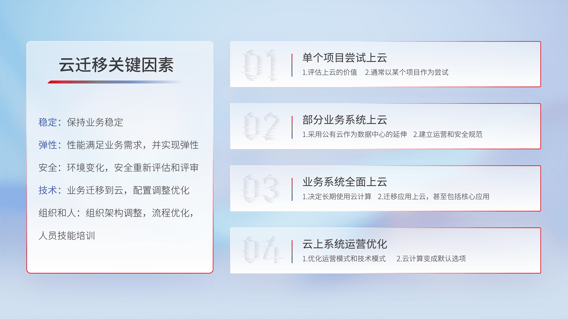 结合实际业务,,,,从规划设计、、、、云平台选型、、、、云原生改造、、、数据迁移、、、集成交付,,,,迁移全过程为客户识别最佳上云路径,,,,做好风险识别管理,,,设计网络架构、、、、身份权限、、安全审计合规、、、、操作审计、、、、日志审计、、监控告警策略、、多站点容灾设计等,,对云上基础设施进行整体规划,,,,提升IT治理水平,,,以满足弹性、、、高可用、、、高性能的需求。。。