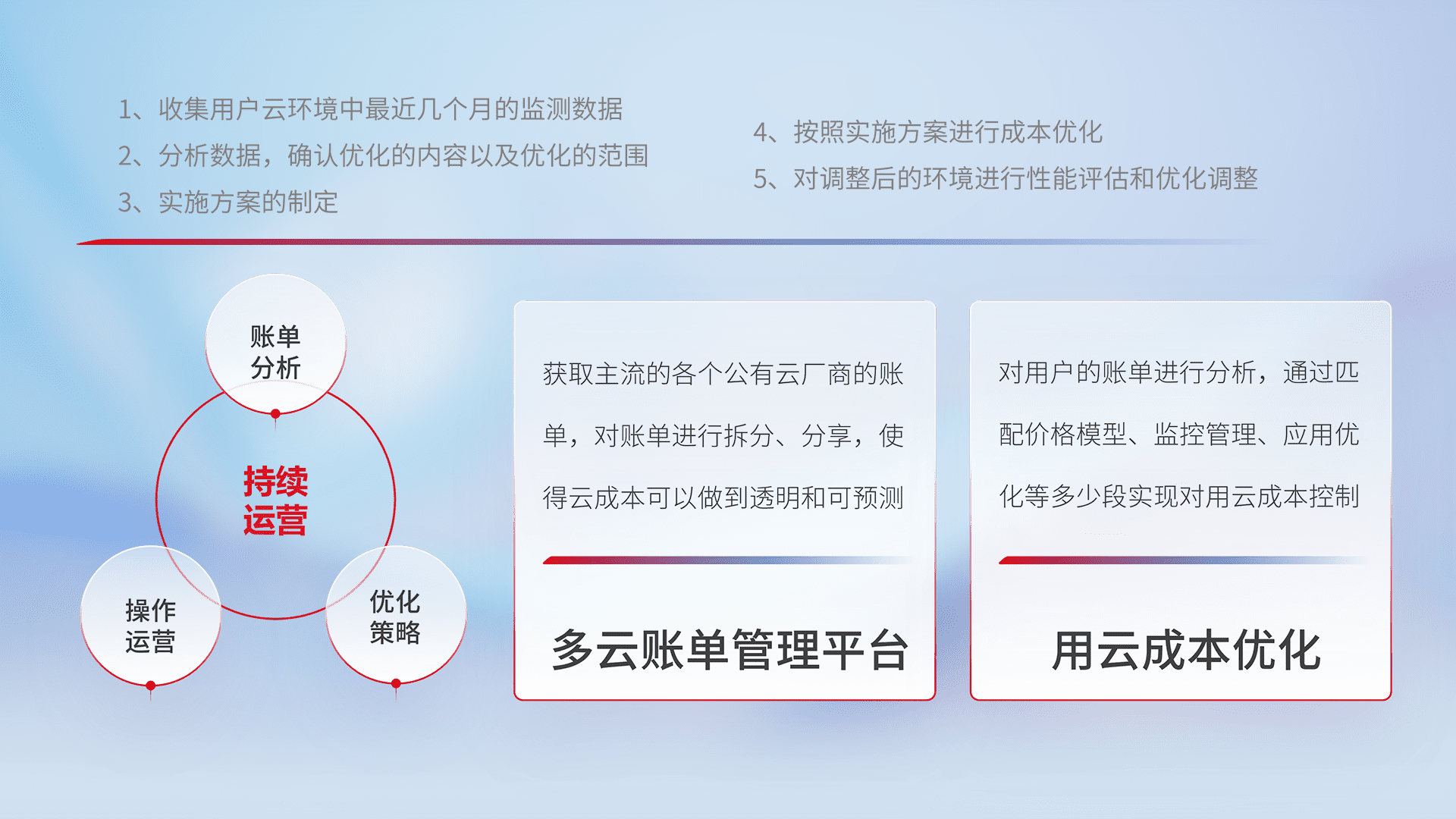 通过多云纳管,,,,以统一的资源数据模型把客户的云资源进行抽象和封装,,,,进而实现对多云资源的统一操作,,,,保障云资源管理的可靠性、、稳定性与可用性。。。量身定制化运维内容,,,配置、、、开发运维、、补丁管理、、、、备份、、、监控、、、、认证和访问管理、、、、审计和日常巡检等,,,保障在用云过程中的可靠度,,,,稳定度以及高可用率。。。。